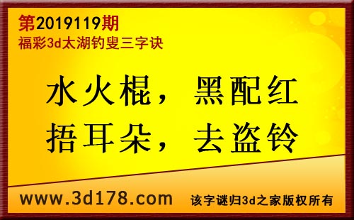 3d第19119期太湖字谜:水火棍,黑配红,捂耳朵,去盗铃