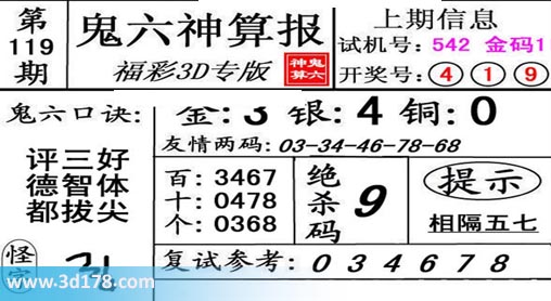 3d第19119期鬼六神算报为您推荐鬼六口诀: