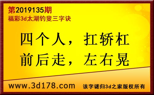 3d第19135期太湖字谜:四个人,扛轿杠,前后走,左右晃
