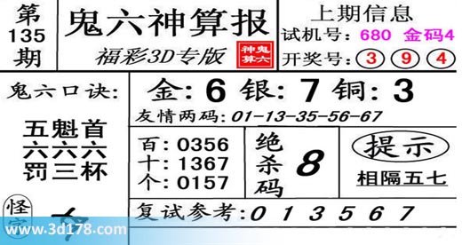 3d第19135期鬼六神算报为您推荐鬼六口诀: