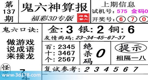 3d第19137期鬼六神算报为您推荐鬼六口诀: