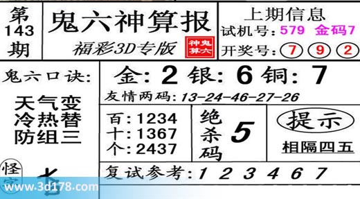 3d第19143期鬼六神算报为您推荐鬼六口诀: