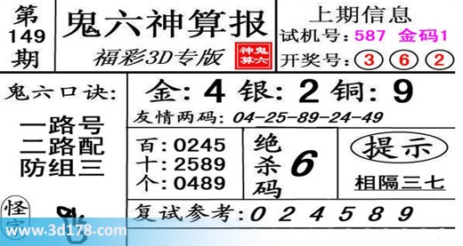 3d第19149期鬼六神算报为您推荐鬼六口诀: