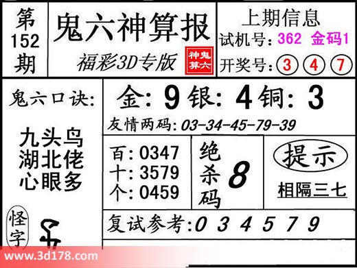 3d第19152期鬼六神算报为您推荐鬼六口诀: