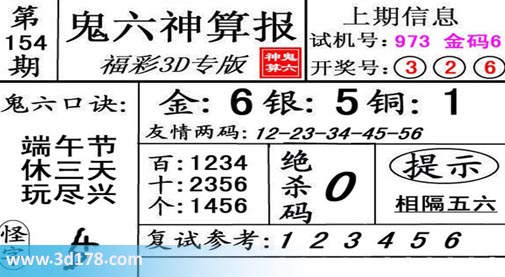 3d第19154期鬼六神算报为您推荐鬼六口诀: