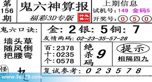 3d第19156期鬼六神算报为您推荐鬼六口诀: