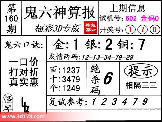 3d第19160期鬼六神算报为您推荐鬼六口诀: