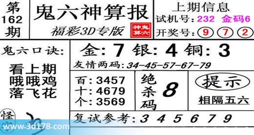 3d第19162期鬼六神算报为您推荐鬼六口诀: