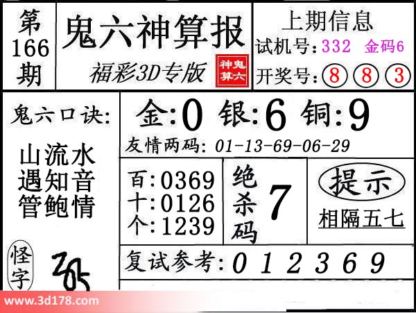 3d第19166期鬼六神算报为您推荐鬼六口诀: