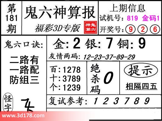 3d第19181期鬼六神算报为您推荐鬼六口诀: