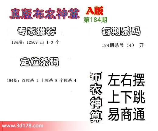 184期杀号(4) 开184期:12569 出 1-3 个 184期:百位杀 1 十位杀 8 个位杀 4布衣神算:左右摆 上下跳 易商通