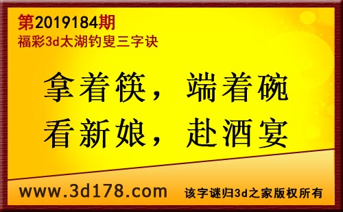 3d第19184期太湖字谜:拿着筷,端着碗,看新娘,赴酒宴