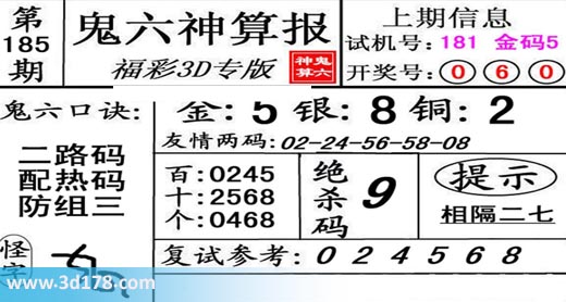 3d第19185期鬼六神算报为您推荐鬼六口诀: