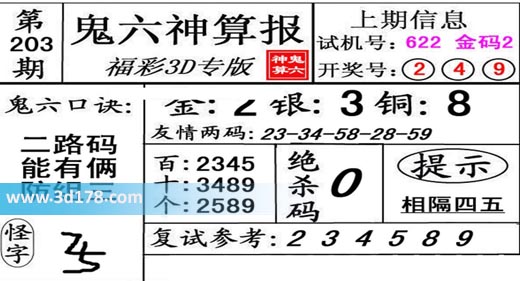 3d第19203期鬼六神算报为您推荐鬼六口诀: