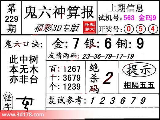 3d第19229期鬼六神算报为您推荐鬼六口诀:
