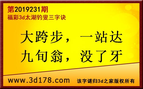 3d第19231期太湖字谜:大跨步,一站达,九旬翁,没了牙