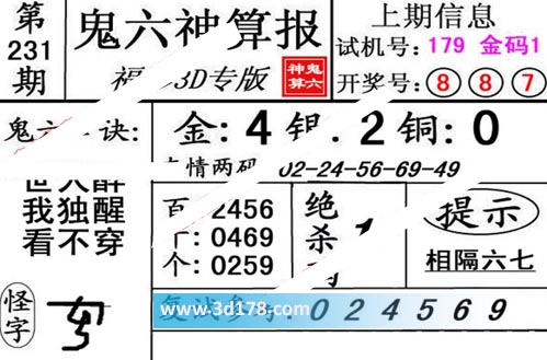 3d第19231期鬼六神算报为您推荐鬼六口诀: