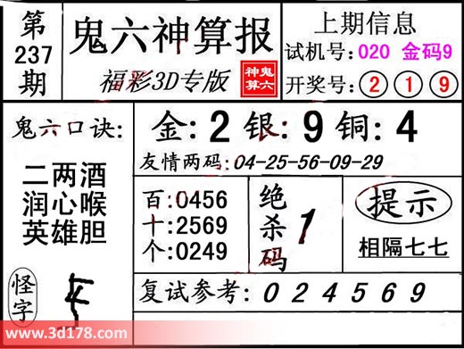 3d第19237期鬼六神算报为您推荐鬼六口诀: