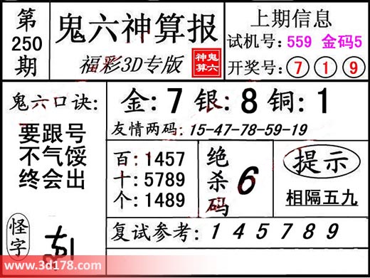 3d第19250期鬼六神算报为您推荐鬼六口诀: