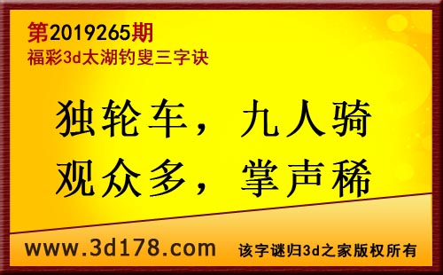 3d第19265期太湖字谜:独轮车,九人骑,观众多,掌声稀