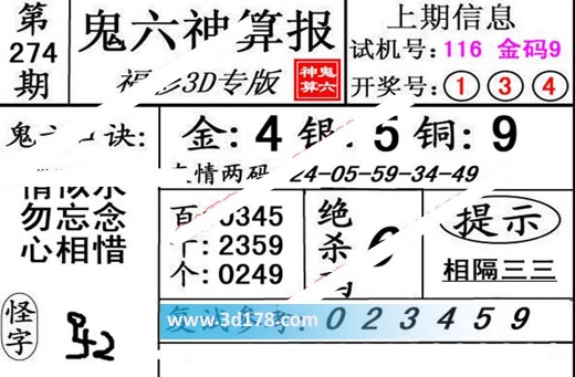 3d第19274期鬼六神算报为您推荐鬼六口诀:
