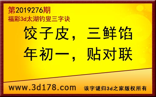 3d第19276期太湖字谜:饺子皮,三鲜馅,年初一,贴对联