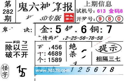 3d第19282期鬼六神算报为您推荐鬼六口诀: