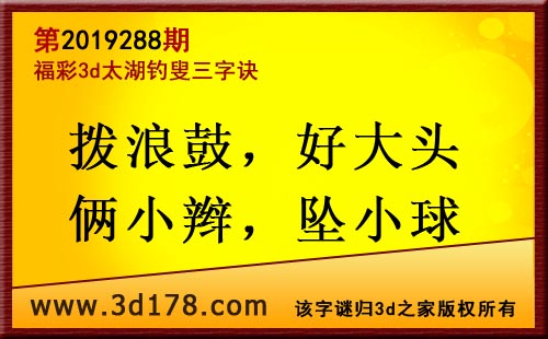 3d第19288期太湖字谜:拨浪鼓,好大头,俩小辫,坠小球