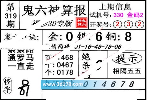 3d第19319期鬼六神算报为您推荐鬼六口诀: