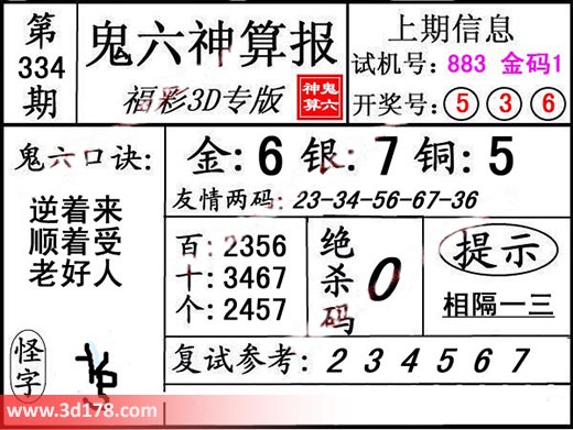 3d第19334期鬼六神算报为您推荐鬼六口诀: