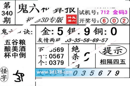 3d第19340期鬼六神算报为您推荐鬼六口诀: