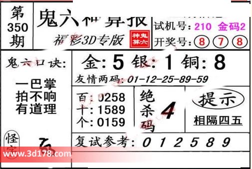 3d第19350期鬼六神算报为您推荐鬼六口诀: