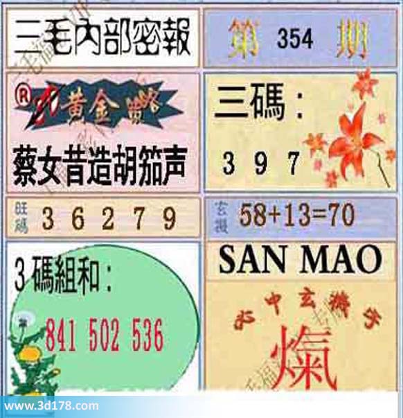 福彩3d第2013354期三毛内部密报图