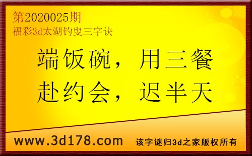 3d第20025太湖字谜:端饭碗,用三餐,赴约会,迟半天