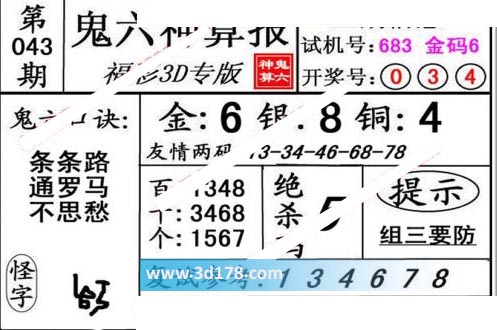 3d第20043期鬼六神算报为您推荐鬼六口诀: