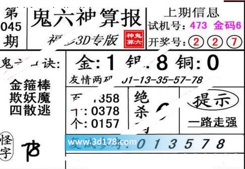 3d第20045期鬼六神算报为您推荐鬼六口诀: