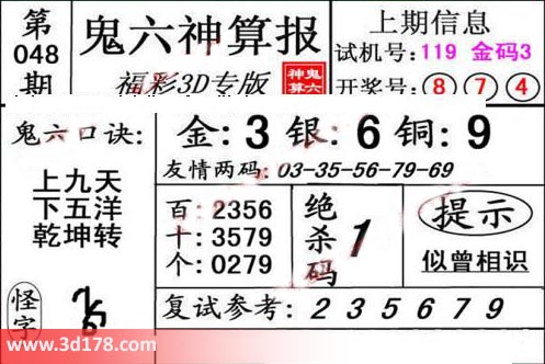 3d第20048期鬼六神算报为您推荐鬼六口诀: