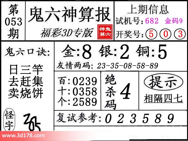 3d第20053期鬼六神算报为您推荐鬼六口诀: