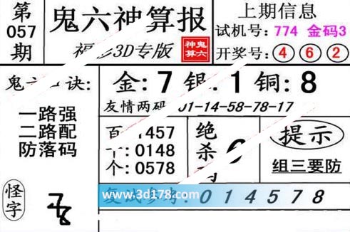 3d第20057期鬼六神算报为您推荐鬼六口诀: