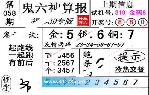 3d第20058期鬼六神算报为您推荐鬼六口诀: