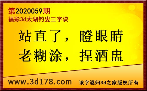 3d第20059太湖字谜:站直了,瞪眼睛,老糊涂,捏酒盅