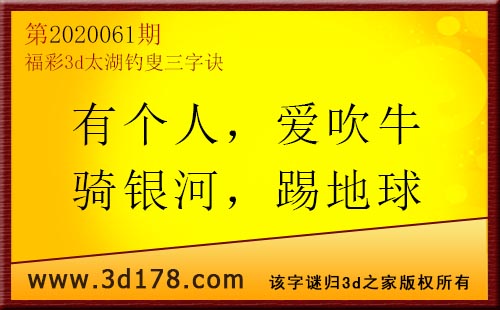 3d第20061太湖字谜:有个人,爱吹牛,骑银河,踢地球