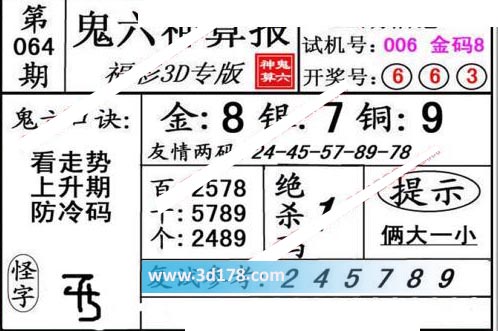 3d第20064期鬼六神算报为您推荐鬼六口诀: