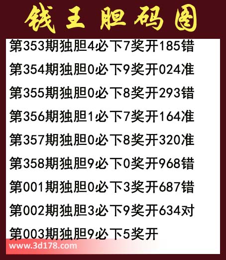 第353期独胆4必下7奖开185错第354期独胆0必下9奖开024准第355期独胆0必下8奖开293错第356期独胆1必下7奖开164准第357期独胆0必下8奖开320准第358期独胆9必下0奖开968错第001期独胆0必下3奖开687错第002期独胆3必下9奖开634对第003期独胆9必下5奖开钱王胆码图库由3D之家3D图库频道原创,仅供彩民参考,温馨提供。