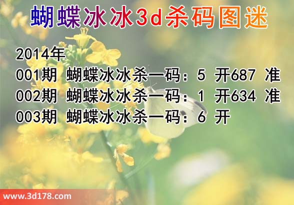 福彩3d之家第2014003期蝴蝶冰冰3d杀码图:2014年001期 蝴蝶冰冰杀一码:5 开687 准002期 蝴蝶冰冰杀一码:1 开634 准003期 蝴蝶冰冰杀一码:6 开
