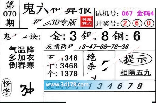 3d第20070期鬼六神算报为您推荐鬼六口诀:
