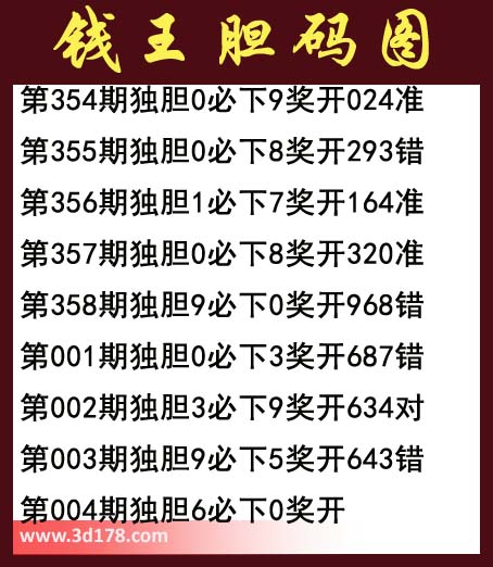 第354期独胆0必下9奖开024准第355期独胆0必下8奖开293错第356期独胆1必下7奖开164准第357期独胆0必下8奖开320准第358期独胆9必下0奖开968错第001期独胆0必下3奖开687错第002期独胆3必下9奖开634对第003期独胆9必下5奖开643错第004期独胆6必下0奖开钱王胆码图库由3D之家3D图库频道原创,仅供彩民参考,温馨提供。