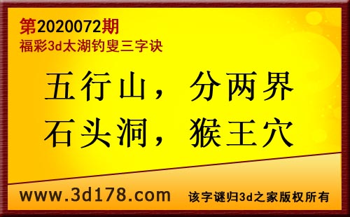 3d第20072太湖字谜:五行山,分两界,石头洞,猴王穴
