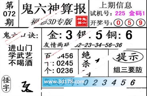 3d第20072期鬼六神算报为您推荐鬼六口诀: