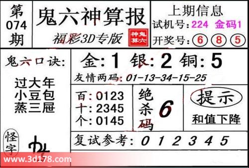 3d第20074期鬼六神算报为您推荐鬼六口诀: